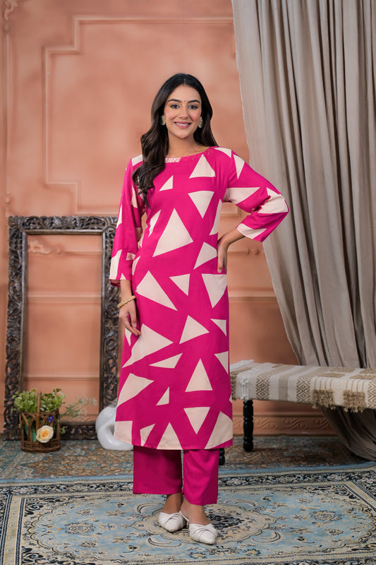 Pink Fuchsia Geometric Printed Two-Piece Kurta Set