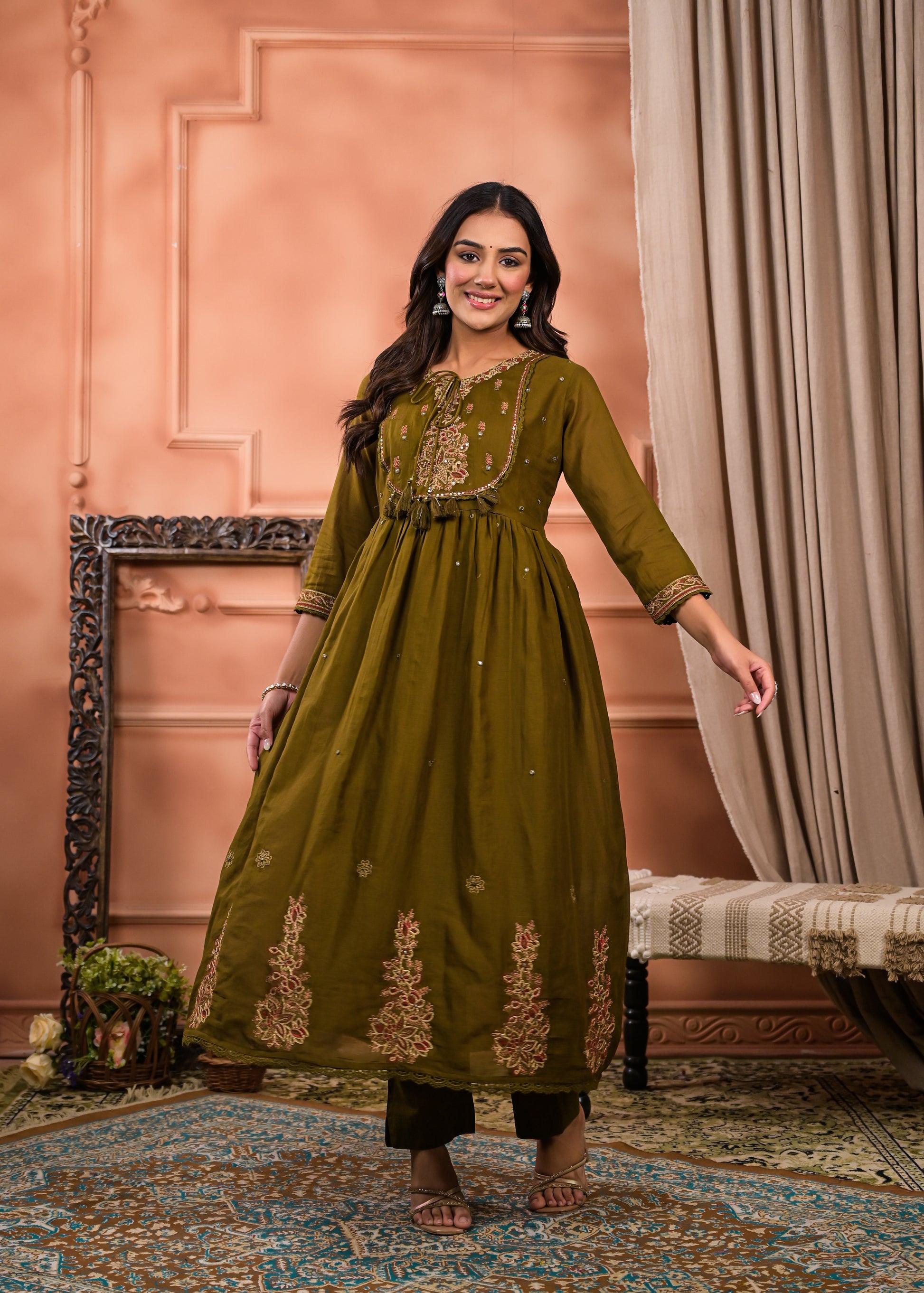A beautiful olive green Anarkali-style kurti adorned with intricate golden and pastel embroidery. The kurti features a fitted yoke with detailed threadwork, three-quarter sleeves with delicate borders, and a flared hem embellished with traditional motifs. Paired with straight black pants and accessorized with statement jhumkas, the outfit exudes a graceful and festive charm—perfect for traditional events, celebrations, or ethnic gatherings.