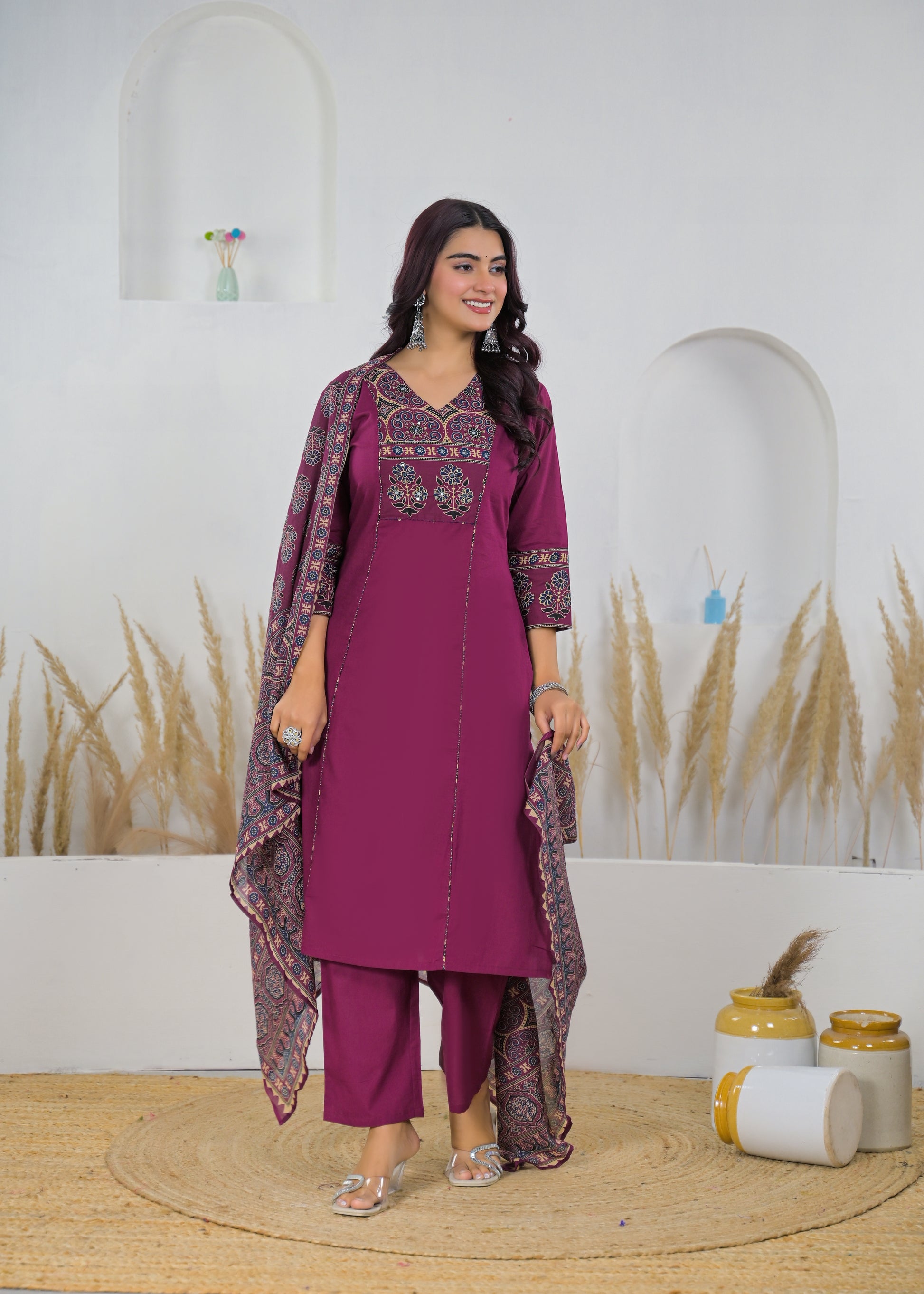 Add a touch of elegance to your wardrobe with this beautifully designed salwar suit set. The mauve kurta features delicate ethnic prints on the neckline and sleeves, giving it a refined and stylish look. It comes with a comfortable matching pant and a soft printed dupatta that completes the outfit with a graceful finish.