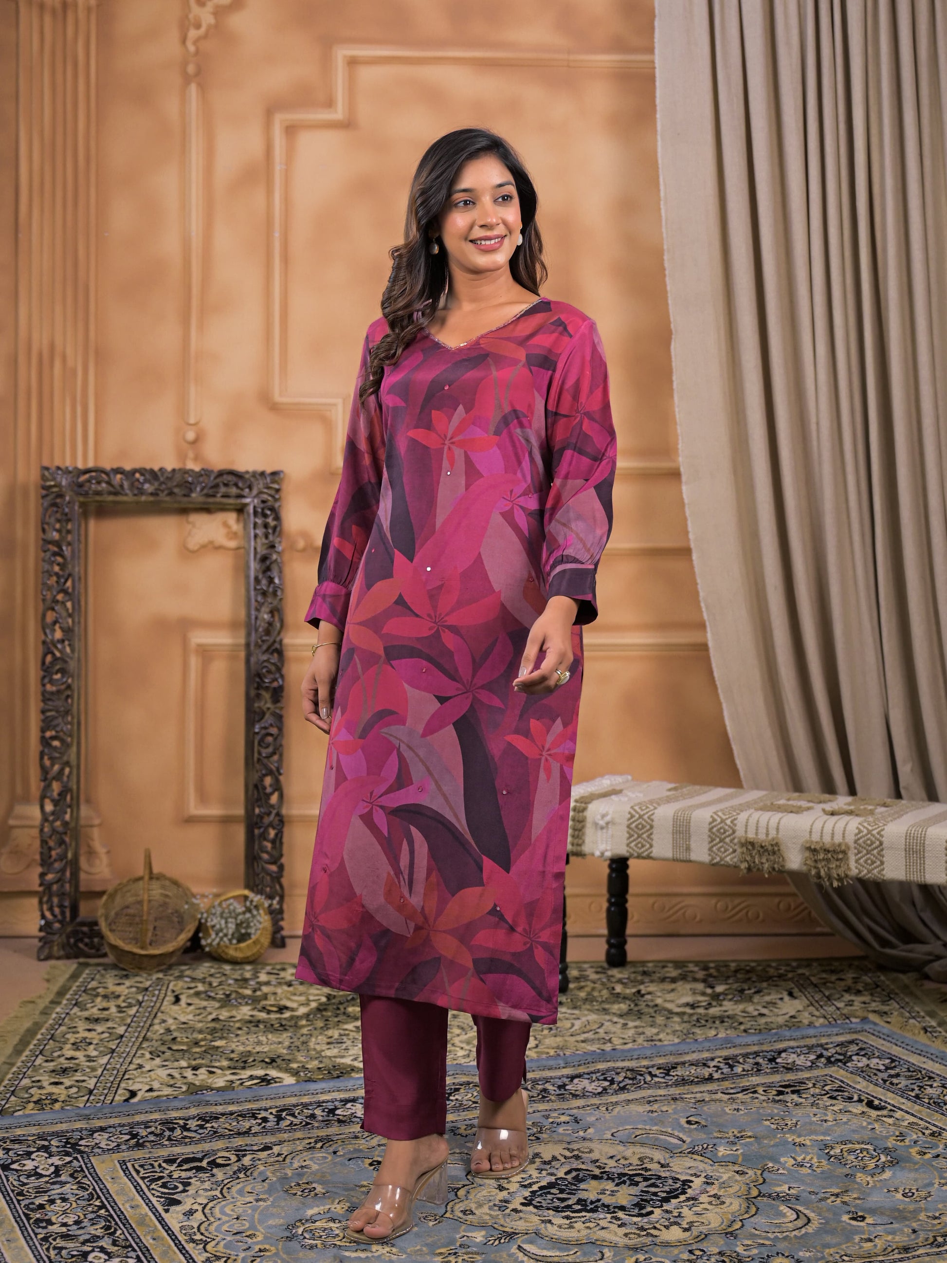 Embrace understated luxury with the Meher Plum Leaf Kurta Set, crafted from soft, breathable Muslin Silk that offers a graceful drape and a gentle sheen. The rich plum hue is adorned with subtle leaf-inspired motifs, bringing together nature’s elegance with a touch of festive charm.