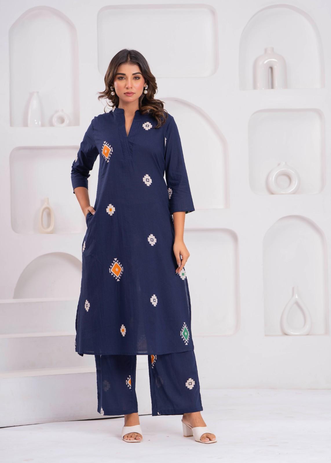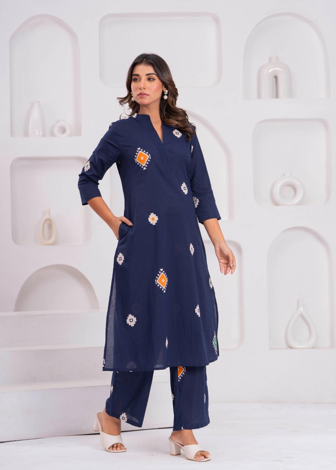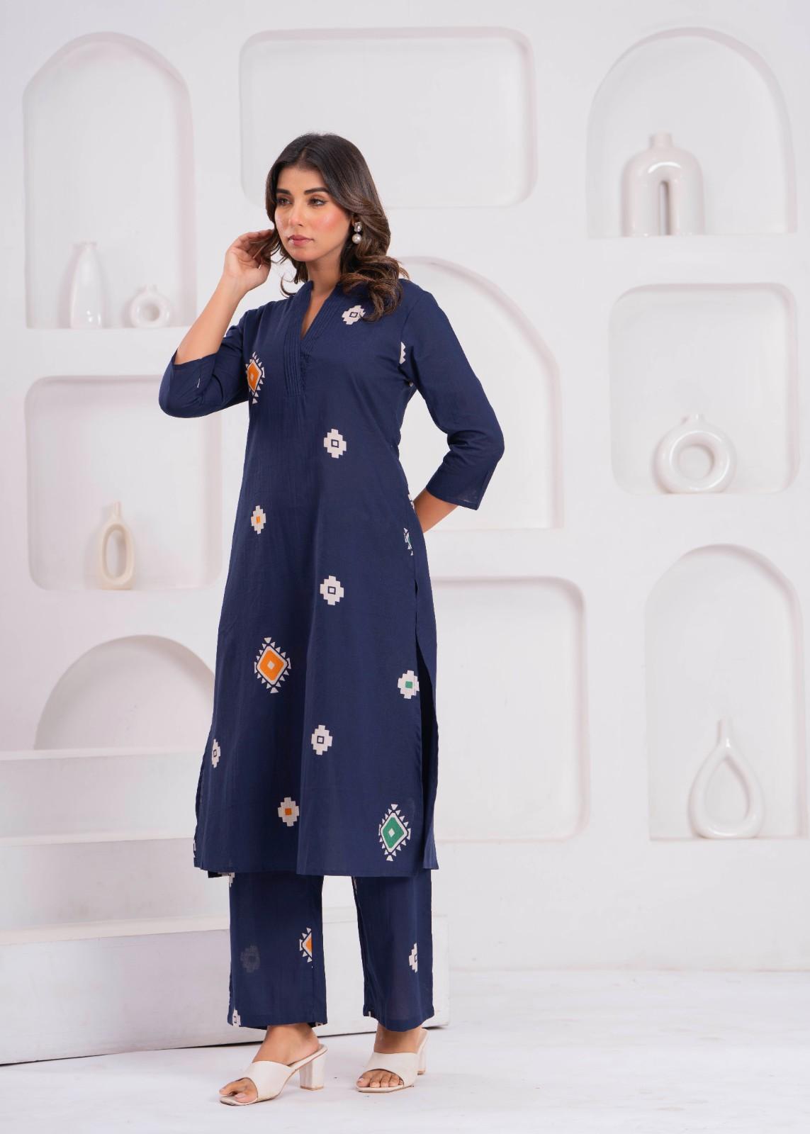 Elevate your everyday style with this elegant navy blue kurti and pant set. Designed with soft, breathable fabric and stylish all-over prints, it offers a modern yet traditional look. The straight-fit kurti features a notch neck, 3/4th sleeves, and comfortable side slits — paired with matching straight pants for an effortlessly chic outfit. Perfect for office wear, casual outings, and daily wear.