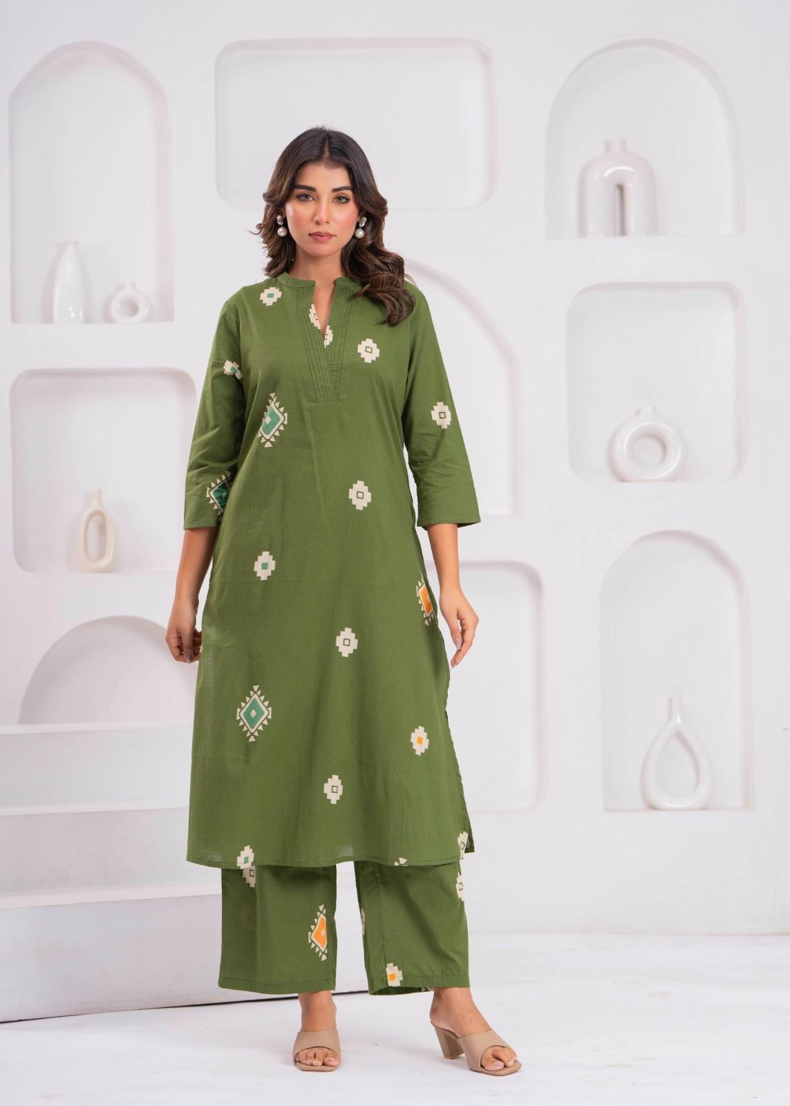 Stay effortlessly stylish with this elegant olive-green kurta set. Crafted from soft, breathable cotton, the kurta features a straight fit with three-quarter sleeves and a simple V-notch neckline for everyday comfort. Subtle ethnic-inspired prints add a charming touch, while the matching straight pants complete the coordinated look. Perfect for casual outings, office wear, or relaxed festive gatherings — pair it with minimal jewelry and sandals for a chic, comfortable style.